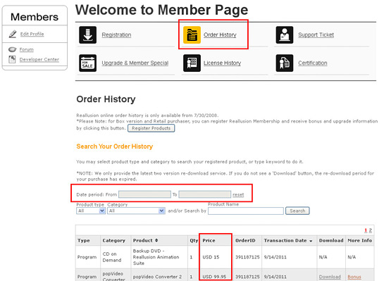 3. You can check every order purchase amount in your Reallusion Member account. Just log into your account, and click “Order History”. You can also use the “Date period” search function to quickly find your purchase amount during Nov. 21st – Dec.31st, 2011.