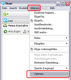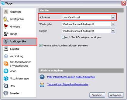 Für die Verbindung von Messenger und Live! Cam Avatar müssen die Audio/Videogeräte manuell eingestellt werden. Nehmen Sie z. B. Skype: