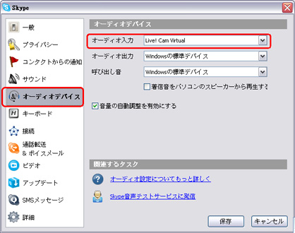 オーディオデバイスを選択して Live! Cam Virtual にオーディオ入力を設定します。