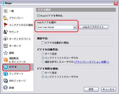 メッセンジャーと Live! の接続に関してCam Avatar では、オーディオ/ビデオデバイスを手動で設定する必要があります。例えば、Skypeの場合: