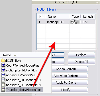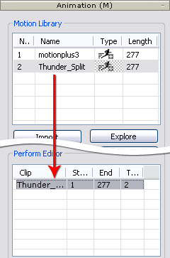 Go to 3DXchange. Add the desired clips from the Motion Library to the Perform Editor.