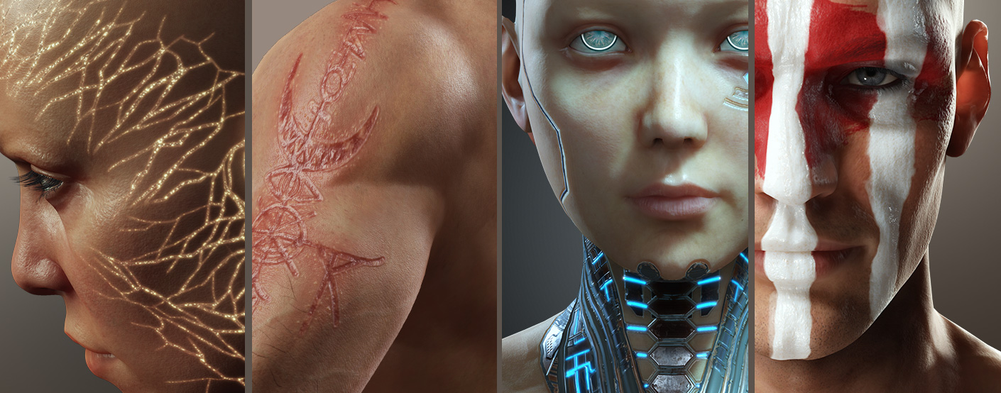 Blemishes, tattoos, sweat and wounds are essential to many character designs. Apply image patterns in combination with imperfection tools to achieve the desired result.