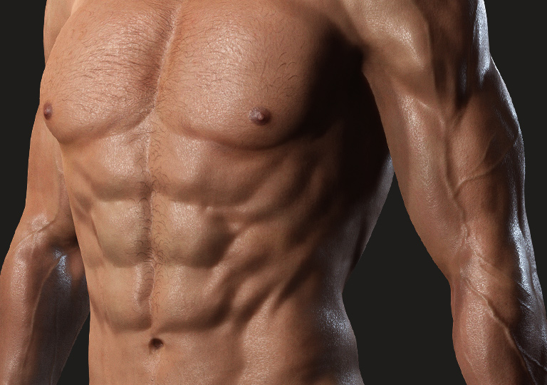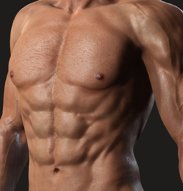 Adjust separate muscle regions with the Part Normal tool. Each area supports different normal intensity levels. The overall normal effect is composed of a master normal map with five separate range masks. With global normal strength adjustments and specific range tuning, one can create muscle, sinew, and wrinkle effects.