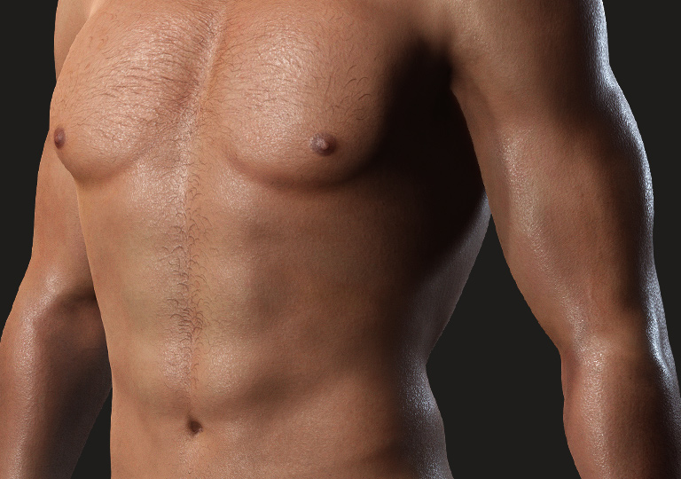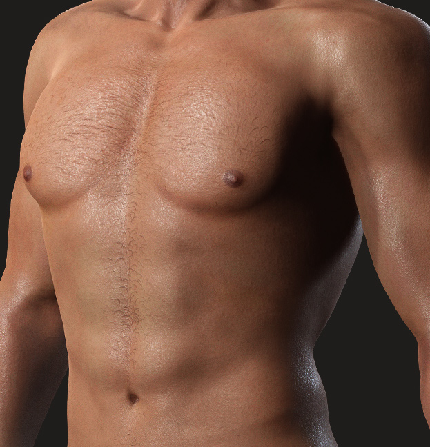 The Body Hair Plus, unlike Body Hair, has three layers, with each one supporting a alpha pattern, a range map for the hair, and a range map for the pores to achieve a shaved look.