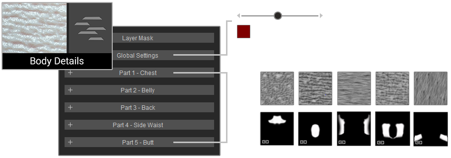 Part Control tool is suitable for applying color differences in large ranges such as suntans. Apply up to three range masks to determine the effective areas, with support for different colors and materials. Normal and Micro-normal effects are also applicable.