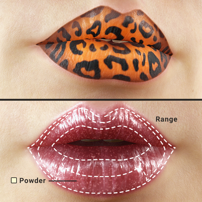 Pucker up with baby pink lips or classic vintage look, and everything in between. The Lip tool has Base, Contour, Heart and Highlight sections inspired from professional makeup artists. Redefine lip ranges with four alpha range images with adjustable colors for each section. Create various lip textures, glitter effects with corresponding material and powder effects.
