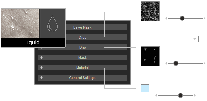 Liquids like sweat are important elements for showing the character in different states. There are two styles for the Liquid tool: Drop and Drip -- Just apply an alpha pattern for each and use the multiple transform sliders to create naturalistic effects and distortions. Change the color, opacity, roughness and more to simulate other effects like blood, glue, wax, etc.