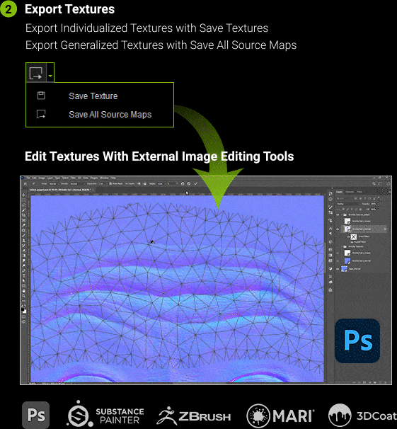 With our innovative flattening technology, you can save and load wrinkle textures and use your favorite image editor to make unique modifications that suit individual characters. You can also modify live wrinkle patterns while ensuring compatibility with all other CC3+ characters. This flexibility lets you bring your creative vision to life with greater precision and ease than ever before.  Manual