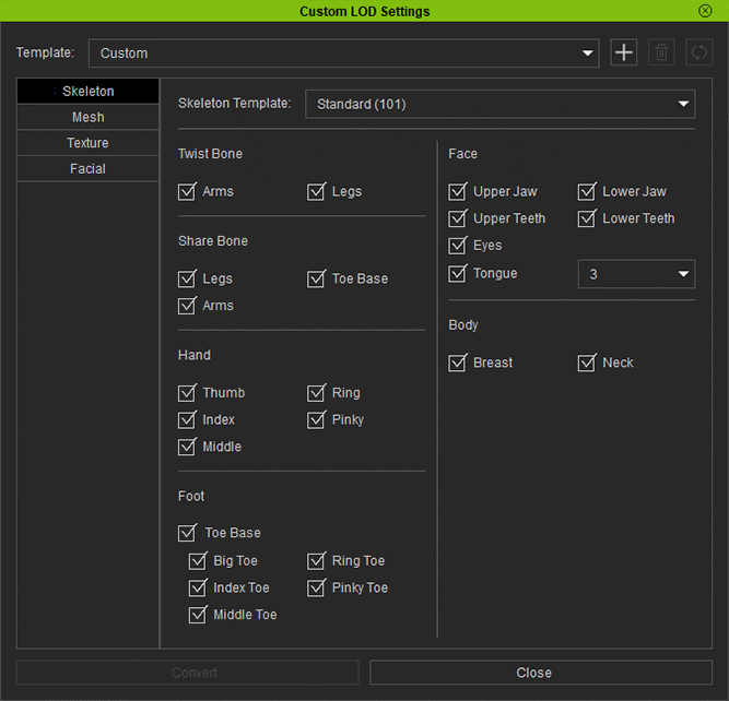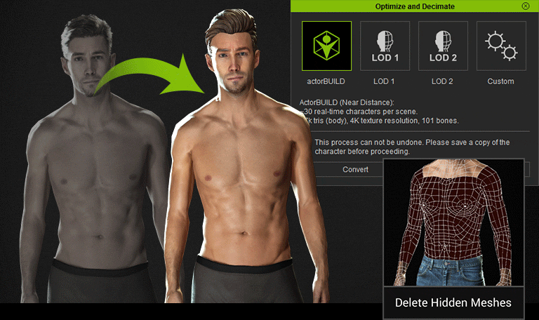 Complete control over the reduction options from one central panel to set bone count, polygon count, texture size, and facial details. Save custom profiles for repetitive conversion processes.