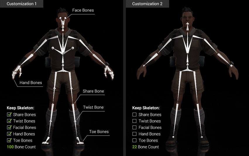 Skin bone animation takes a significant amount of CPU calculation, especially when you have a large amount of characters in the scene. Choose 101 bones (CC3+ standard) for the best visual quality, or 22 bones for the highest performance. Bone reduction also helps on cross application character compatibility for mobile games or virtual experiences that usually require a simpler bone structure.