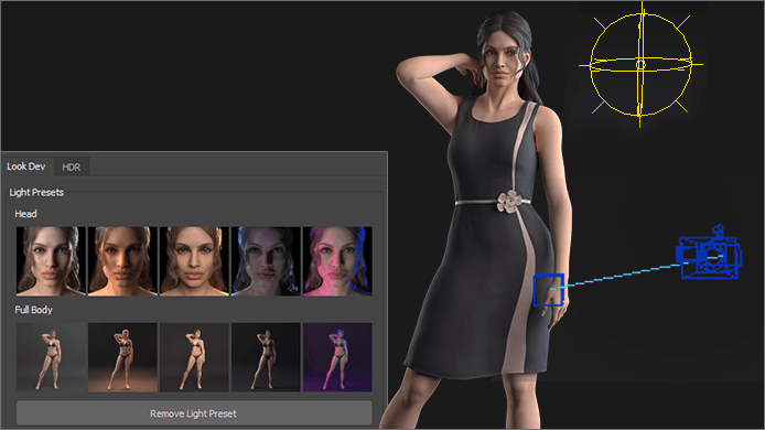 Professional light and camera setups ensure optimal character presentation. This includes five setups for close-up views and five for full shots, each adjustable to achieve the desired visual outcome, whether for high-quality main characters or low-poly crowd and extras.