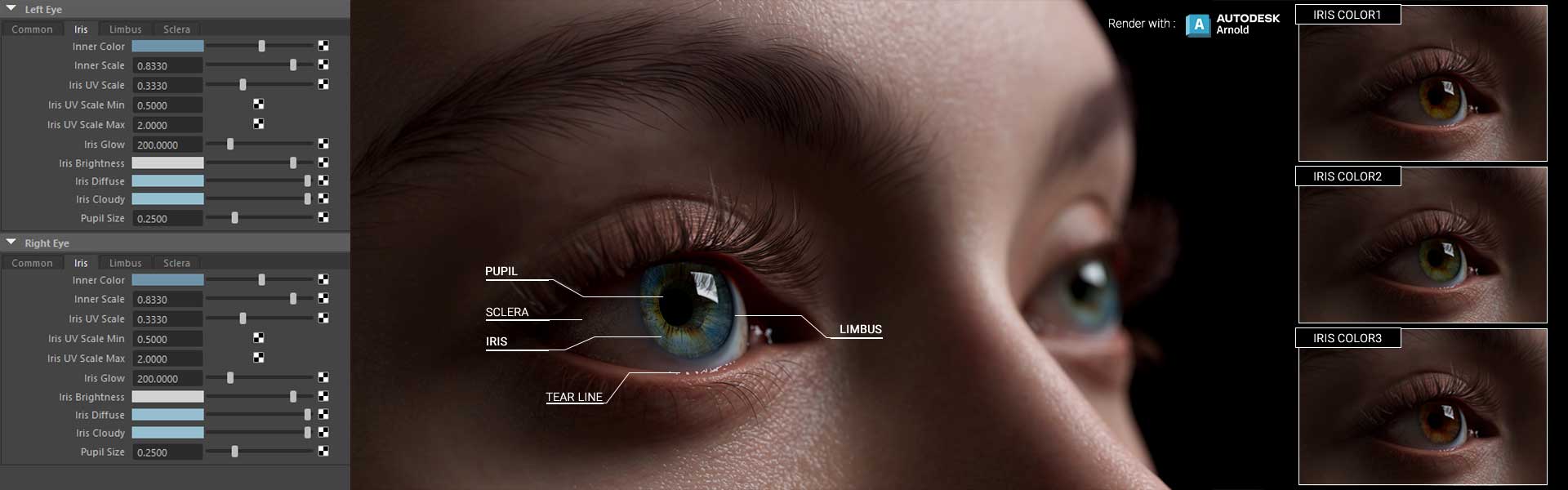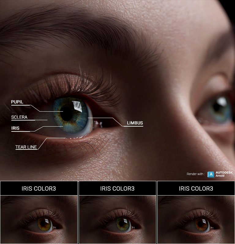 Auto Setup eye shader includes fully adjustable iris, sclera, limbus, and pupil components. Anatomical accuracy is represented with realistic roughness, depth, and refraction effects. Personalization is instilled with refined levels of coloring, brightness, and specularity.
