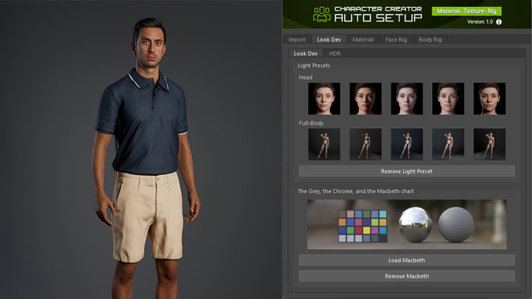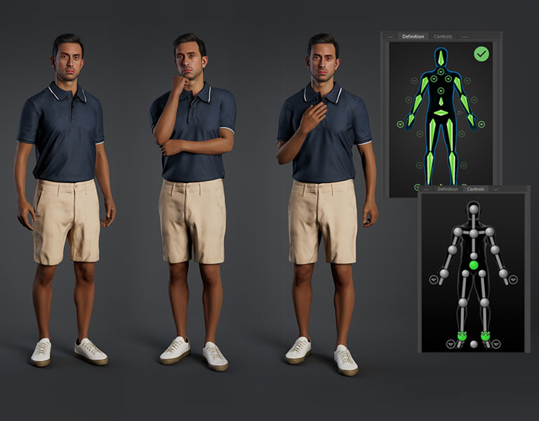Professional light and camera setups ensure optimal character presentation. Five ready-to-use setups are available for close-up views and five for full shots, each adjustable to achieve the desired visual outcome, whether for high-quality main characters or low-poly crowd and extras.
