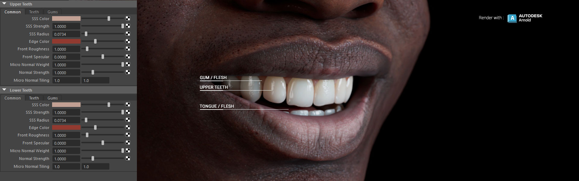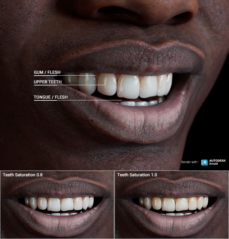 Teeth color and brightness can vary based on health, age, and wear. Whether you need a radiant smile with neat and glistening teeth or a ferocious creature with intimidating fangs, the Teeth Shader can achieve any look. Shader effects can be combined with CC morph sliders to make teeth stand out with photorealistic rendering, and ambient occlusion can effectively darken the mouth cavity, adding depth and realistic shading.