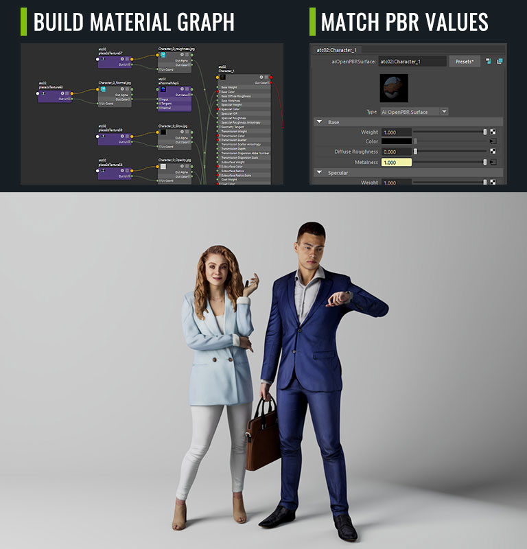 ActorCore crowd characters feature optimized topology and single PBR materials for superior rendering performance. Auto Setup eliminates the guesswork when exporting to Maya with the seamless transfer and conversion of PBR materials.
