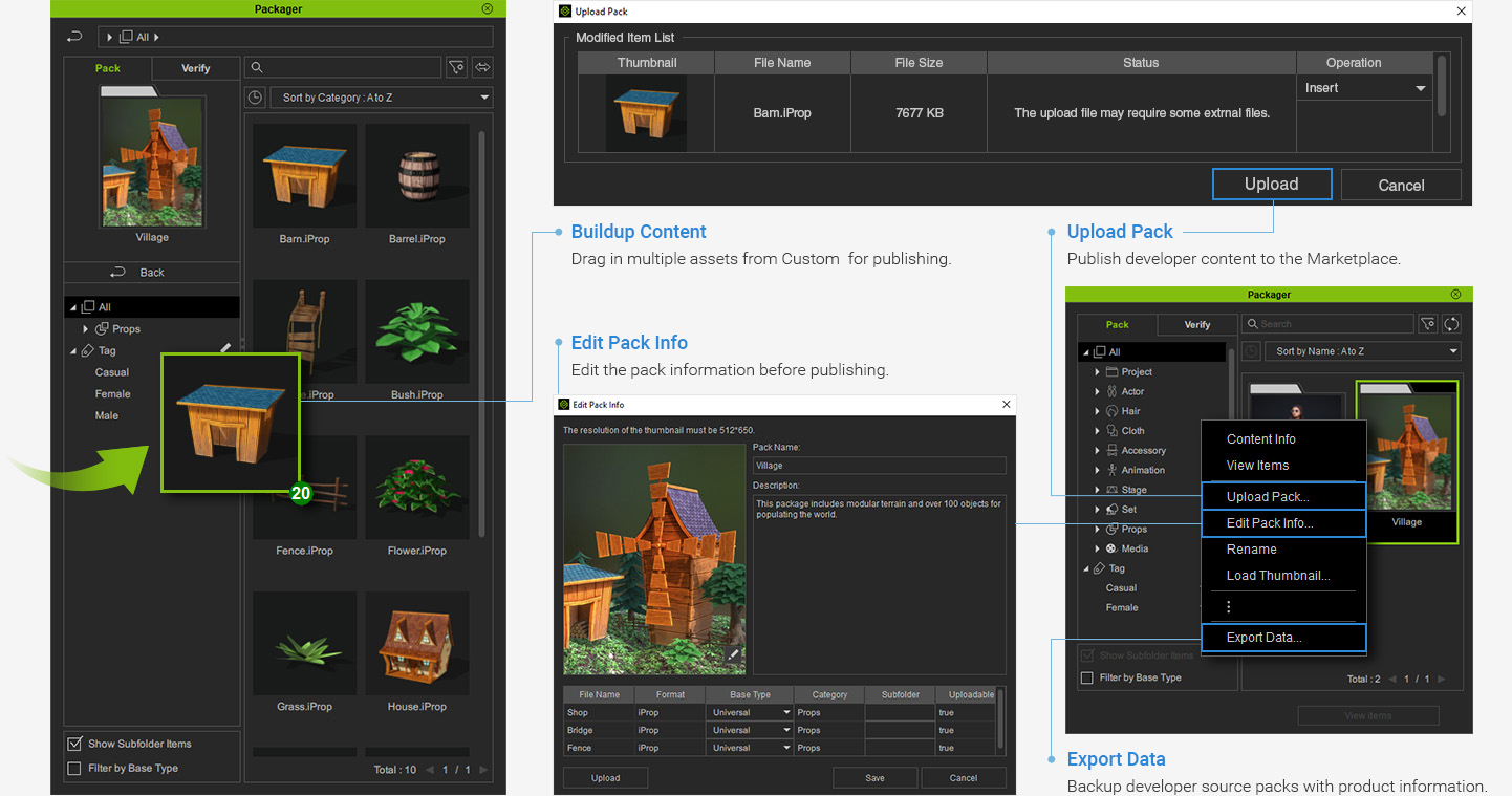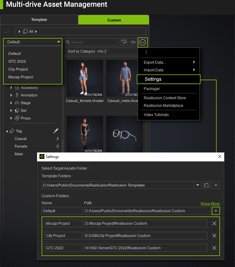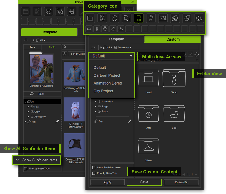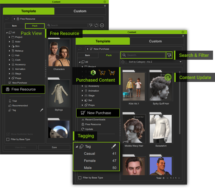 5 Complete SetsThe Smart Content Manager brings an intuitive and streamlined content experience while managing assets. Users can download free or purchased assets right in the iClone and Character Creator interface, quickly search installed and custom content by keywords or tags, and organize content in different drives without worrying about storage limit. Owners of multiple program licenses that have been registered under the same workgroup account can share any purchased content among group members and centrally manage them through a corporate server.