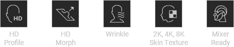 A new generation of HD character assets is here to help you jumpstart your creations or dive into detailed character generation. Each character features a unique expression profile, dynamic wrinkle set, and is fully ready for animation and facial mocap. Take advantage of subdivision levels, prebaked normal and displacement maps, and texture sets available in 2K, 4K, and 8K resolutions.