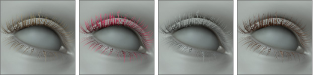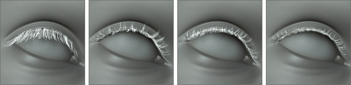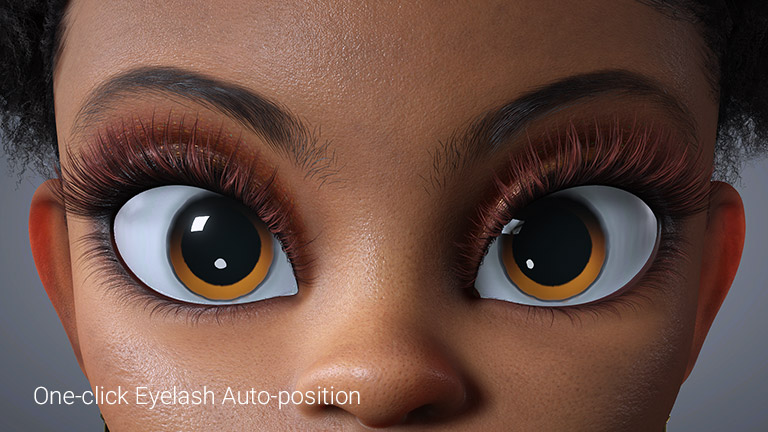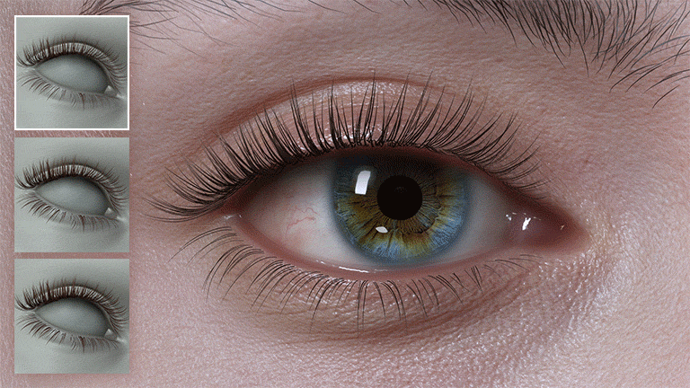 The Smart Hair Shader brings delicate, natural-looking eyelashes to life. Its many options provide full control over color variations over clumps and root to tip transitions. Additional specularity adds realism, allowing lashes to catch light naturally in any environment.