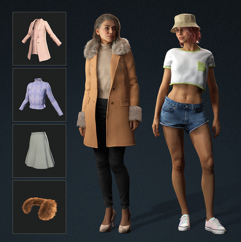 A slim-down CC avatar with game-base character topology (around 10K triangle), and polygon reduction on cloth and accessories.