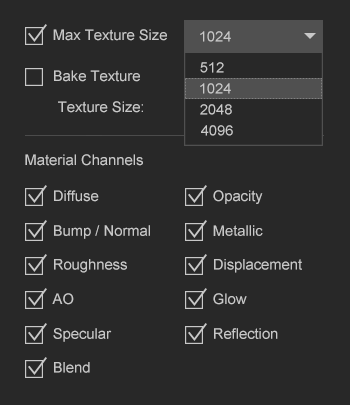 | Texture Size | 4096 multi-channels for 4 body materials | 4096 | 1024 | 512 | |