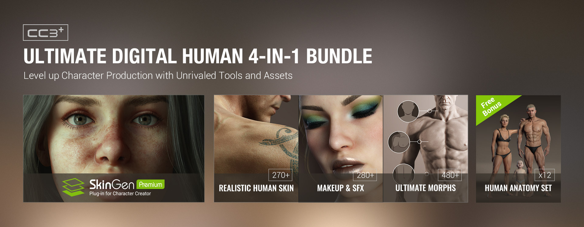 SkinGen (basic version) is included as a free update in CC(afterv3.3). Along with embedded sample Skins and Makeup assets, all users will be able to enjoy the layer stack and rich slider adjustments. Please note that the new character base (CC3 Base+) is required to present the new quality for SkinGen.