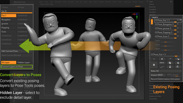 Serving as a macro to existing ZBrush features, Pose Tools seamlessly syncs up with ZBrush layers and their associated subtools.