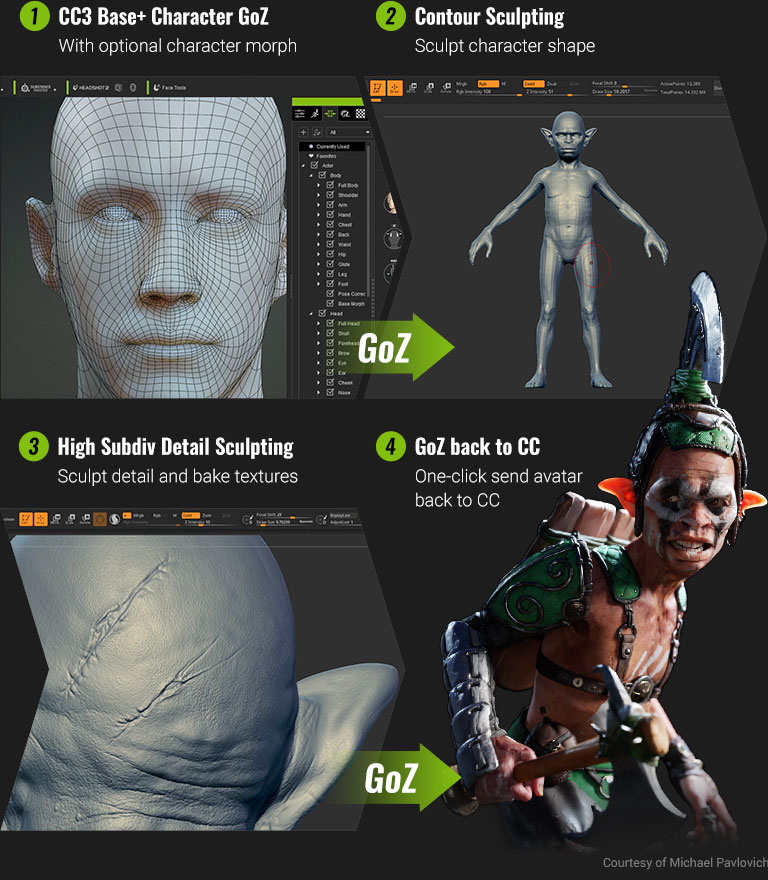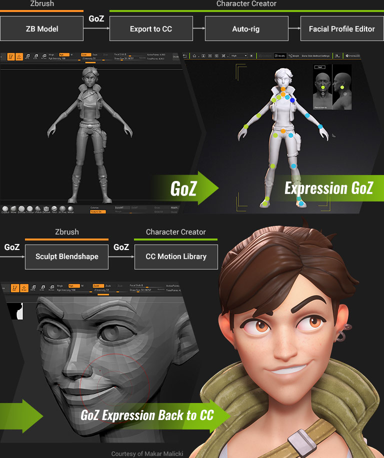 Begin with a preliminary version of the fully-rigged CC base model; use GoZ to enhance its appearance through ZBrush sculpting or painting; and seamlessly return to CC. Marvel at the shape and texture transformation, accompanied by personalized facial and body animations.