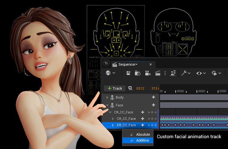 《Digital Soul 100+》等必备内容包为您的CC角色注入独特的个性。iClone具有精确的语音口型同步、情感木偶表情、基于肌肉的面部关键帧编辑以及利用iPhone或AccuFACE视频AI捕捉的面部动捕功能。