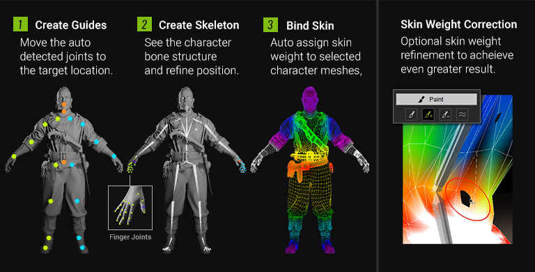 绑定角色的动画质量高度依赖于与其控制骨骼相关的正确蒙皮权重分配。AccuRIG 模仿专业绑定师的权重绘制模式,实现身体关节的自然运动。