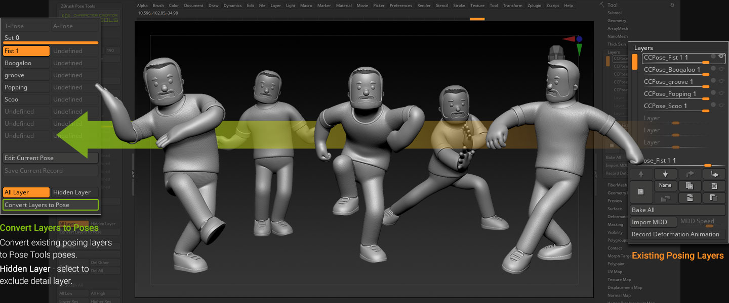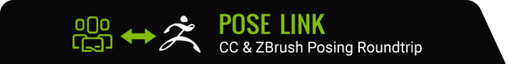 要充分利用 ZBrush Pose Tools,首先从 ZBrush 层导入现有姿势。可以选择导入所有层或选择性导入隐藏层。这些转换后的层会标记为“ccPose_”,以保持 ZBrush 层与姿势库之间的同步。