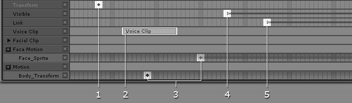 In CrazyTalk Animator, there are 5 types of data in the tracks for Timeline Editing- Key, Clip, Representative Key or Switch, Target-switching, and On/Off.