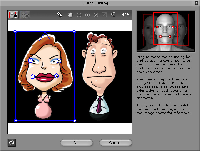 The Face Fitting step is next. Click and move the indicators numbered 1, 2, 3, and 4 on the image to provide the four points for the fitting process as displayed in the sample image. You may also click the Face Fitting button to start the Face Fitting step again after exiting the wizard to add or delete models.