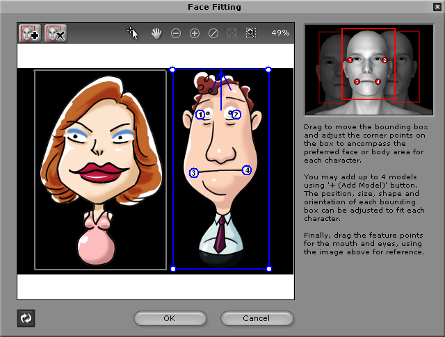 The Face Fitting step is next. Click and move the indicators numbered 1, 2, 3, and 4 on the image to provide the four points for the fitting process as displayed in the sample image. You may also click the Face Fitting
