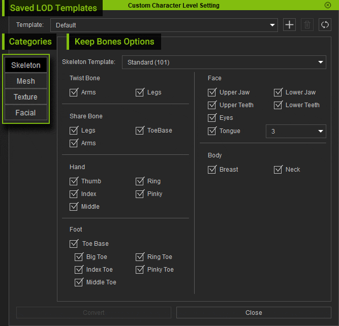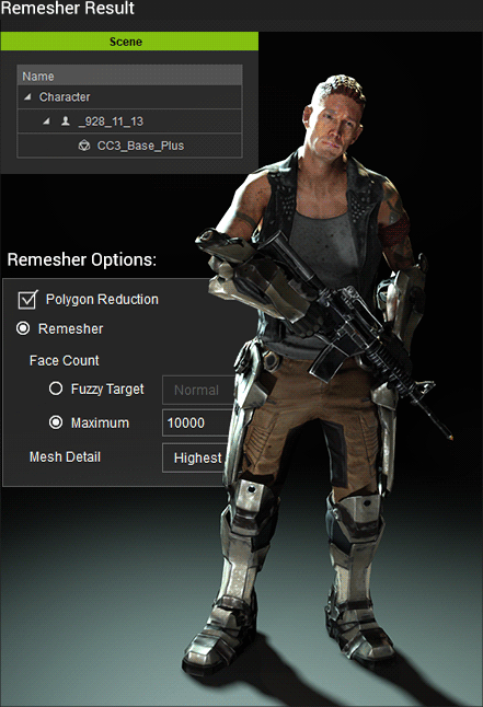 Über ein zentrales Bedienfeld haben Sie die uneingeschränkte Kontrolle über die Reduktionsoptionen und können die Anzahl der Knochen, Polygone, Texturen und Gesichtsdetails des Charakters steuern sowie benutzerdefinierte Profile für wiederholte Konvertierungsprozesse speichern.