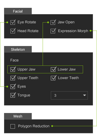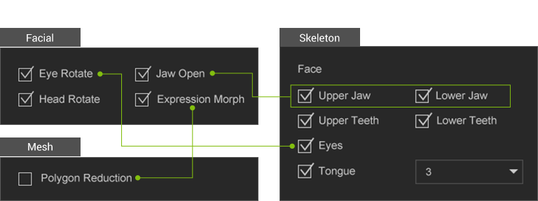Wenn ein Charakter weiter von der Kamera entfernt ist, werden die Daten für die Gesichtsanimation, einschließlich unzähliger Ausdrucksmorphs und Lippenformen, überflüssig. Mit dem Bedienfeld "Gesichtsreduktion" können Designer optional Blendshapes, Zähne und Zunge sowie Gesichtsknochen entfernen, um eine optimale Echtzeitleistung zu erzielen.