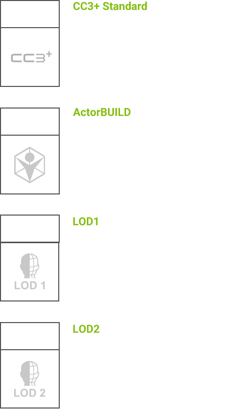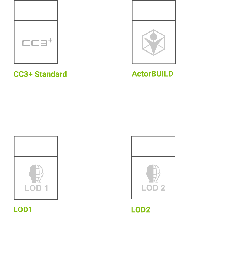 | Charakter Level | Subdivision Export | CC Avatar (CC3+) | actorBUILD | LOD 1 | LOD 2 |
