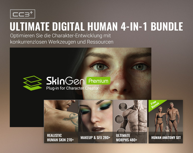SkinGen ist ein bedeutender Durchbruch beim Erstellen digitaler Menschen, da es ein ultrarealistisches dynamisches Materialsystem für die Erzeugung menschlicher Haut einführt. Eingebettet in branchenführende Scan-basierte Ressourcen lässt SkinGen die CC3+ Charaktere nicht nur großartig aussehen, sondern bereichert auch bestehende Projekte mit einem signifikanten visuellen Upgrade.