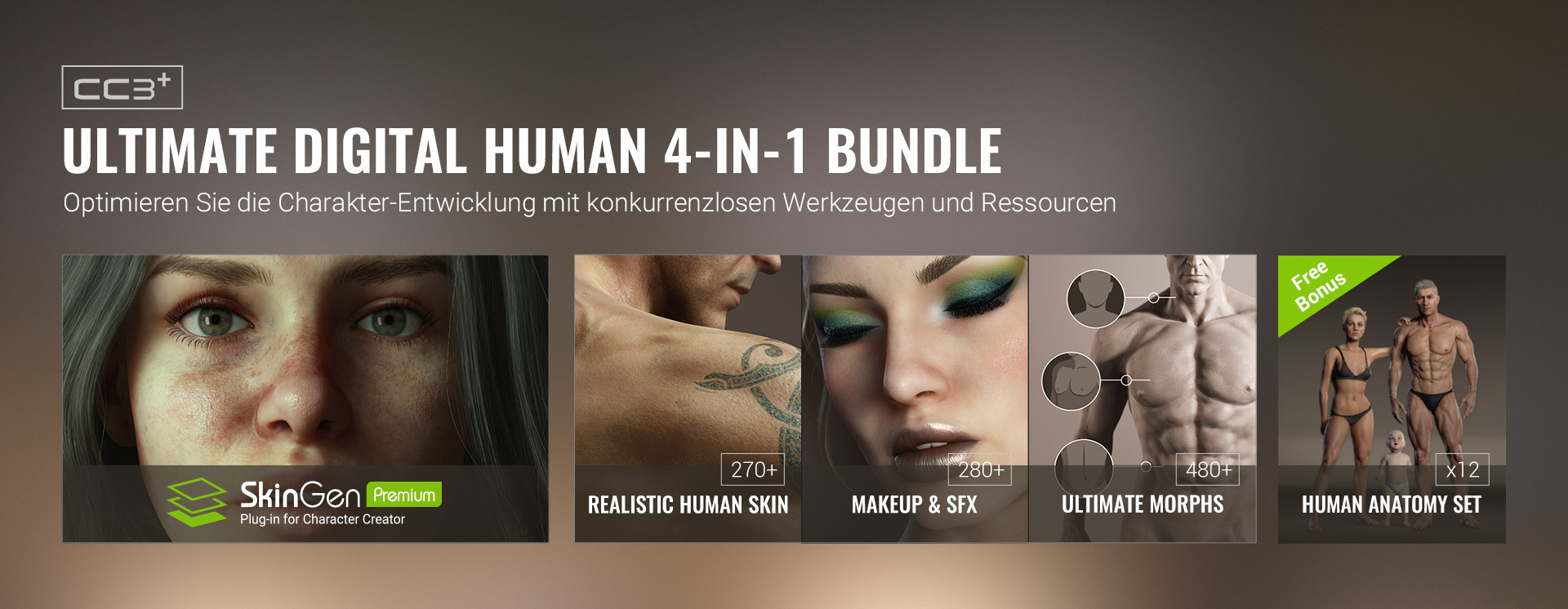 Die qualitativ hochwertigsten Skin-Ressourcen-Partner und die leistungsstarke dynamische Materialtechnologie ermöglichten es Reallusion, SkinGen zu entwickeln. Das Niveau der einfachen, leistungsstarken und realistischen Lösungen zur Gestaltung digitaler Menschen ist beispiellos. Wir empfehlen den Anwendern die Verwendung von weiteren TexturingXYZ-Ressourcen mit SkinGen zum Erzeugen faszinierender Hautvariationen und optimalen Nutzung dynamischer Substance Materialien mit dem Character Creator.