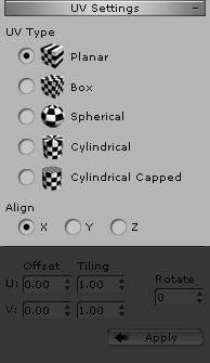 Users can use the following UV Types to wrap a bitmap image around a 3D surface regardless of its original UV coordinates. Simply choose the UV type that fits the topology of your target 3D model the best. Please refer to the Mapping Method for Multi-Material Object section for more information.