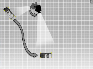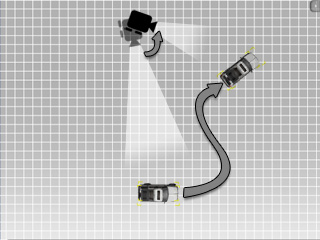 The camera is driven to rotate and follow the moving car. |