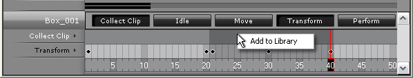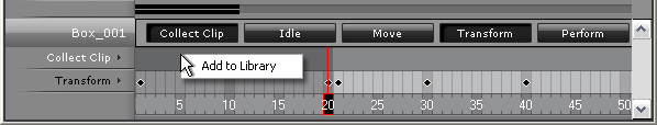 Öffnen Sie jetzt die Clips sammeln Spur des Blocks und markieren Sie den Bereich der Frames 1 - 20. Klicken Sie auf die rechte Maustaste und wählen Sie Zur Bibliothek hinzufügen. Benennen Sie die Datei mit Taking Off.