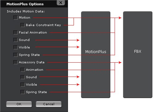 Although MotionPlus contains many types of data, when you want to export it into FBX format, some data unsupported by FBX will be ignored and removed from the file. Meanwhile, the motions or animation related data will be baked and flattened to the bones (please also refer to the Icon in Motion Library section for more information):