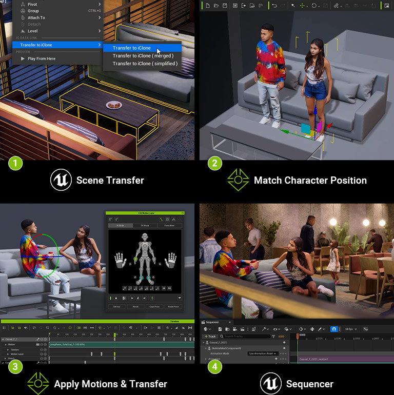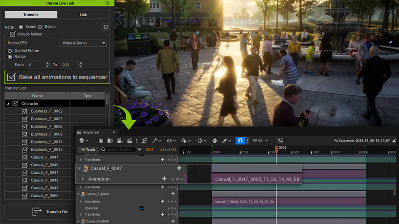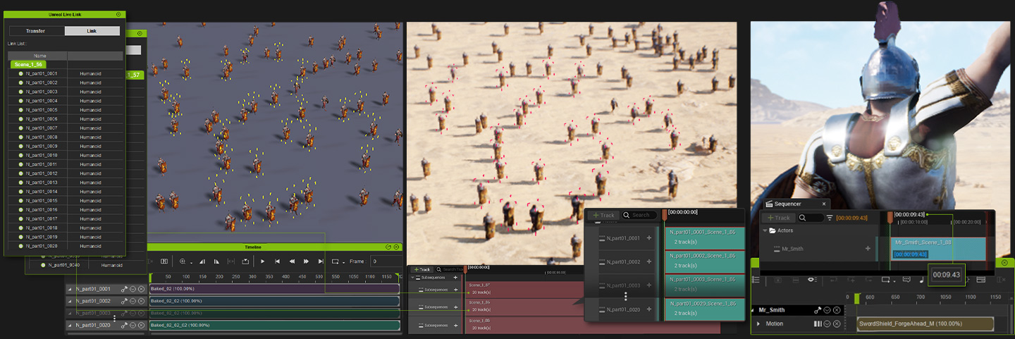 Transferring large amounts of animations to Unreal Engine becomes a well managed task with Timecode Syncing. Designers can group animated characters in iClone, full-frame timecode record iClone animations into UE sequence files, gradually build up the large crowd for final Sequencer editing.