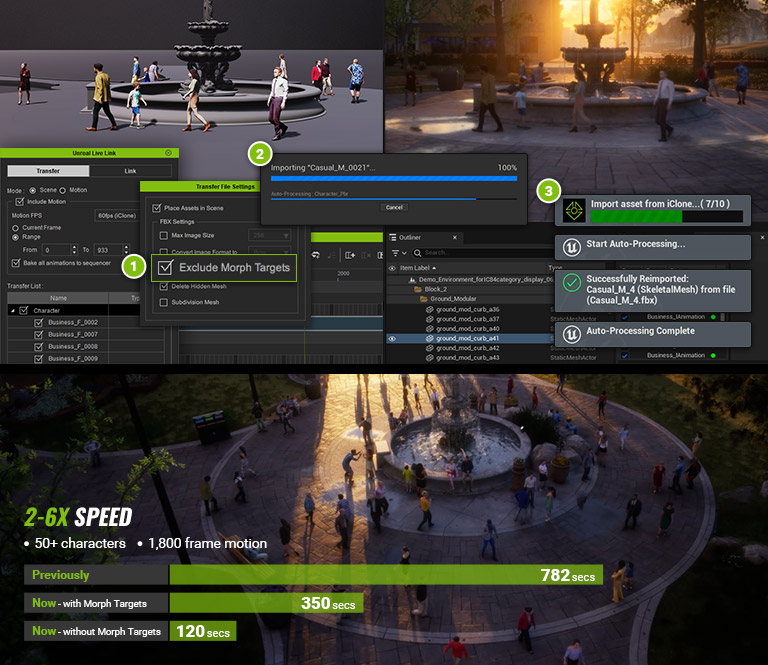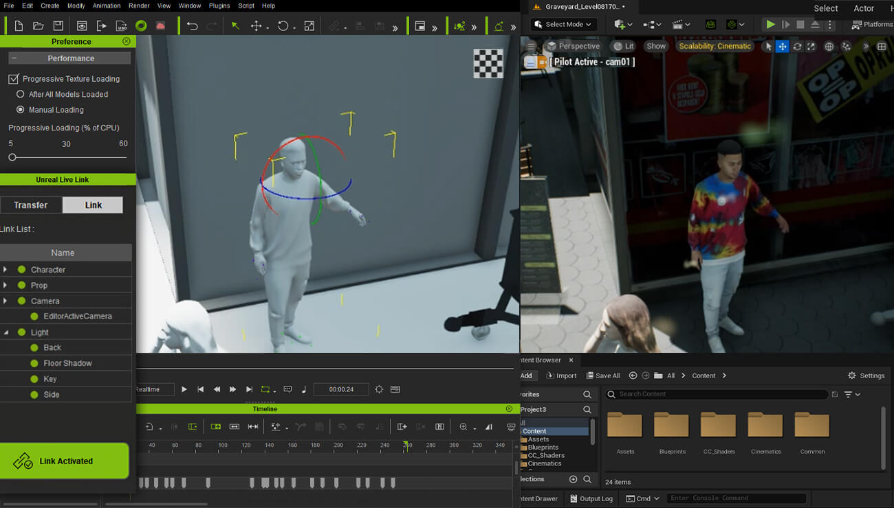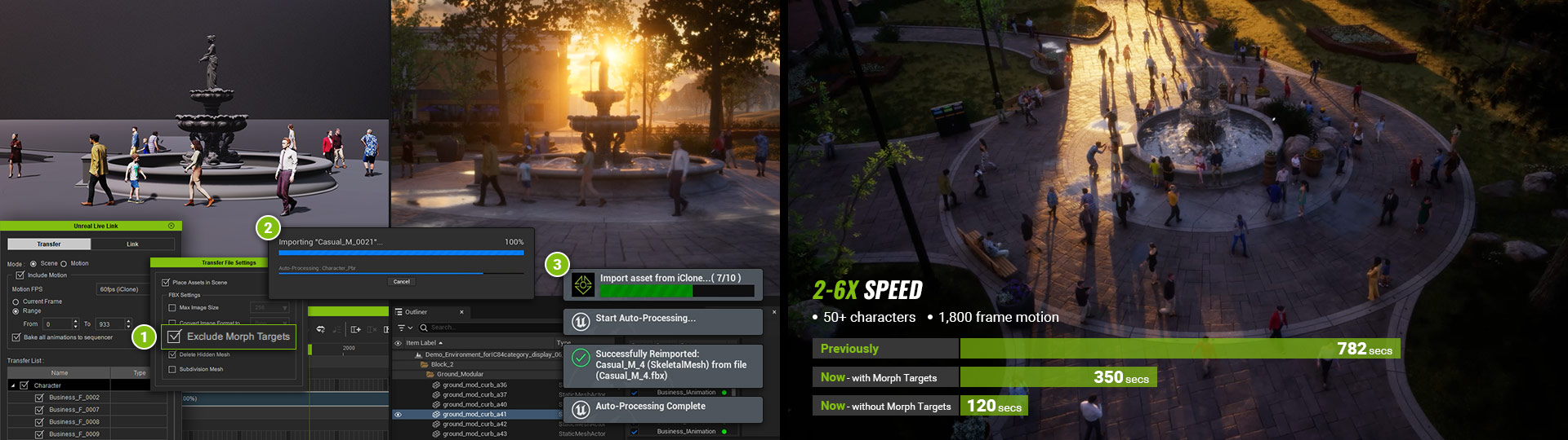 Our unique Progressive/Deferred Texture Loading technology allows users to Live Link animations from iClone without taxing the system resources. Keeping the scene texture-less in iClone frees up graphics memory that can be dedicated to rendering in Unreal Engine.