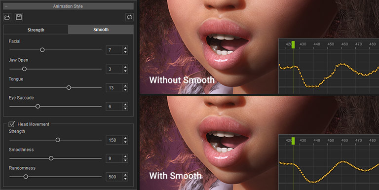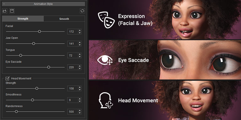 Animations can be tweaked via a dynamic interface. Adjust various parameters such as expression strengths, head movements, or adding darting eyes to enliven the performance. Enlarge the jaw open range to enhance emotional tension and fine-tune the position of the tongue to mimic precise enunciation.