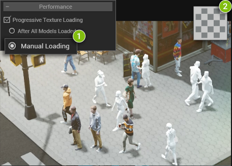 When “Manual Loading” is enabled, users can press the Load Textures icon overlaid on the viewport to stream in the texture files. The loading speed is determined by your preference settings for the GPU ratio.