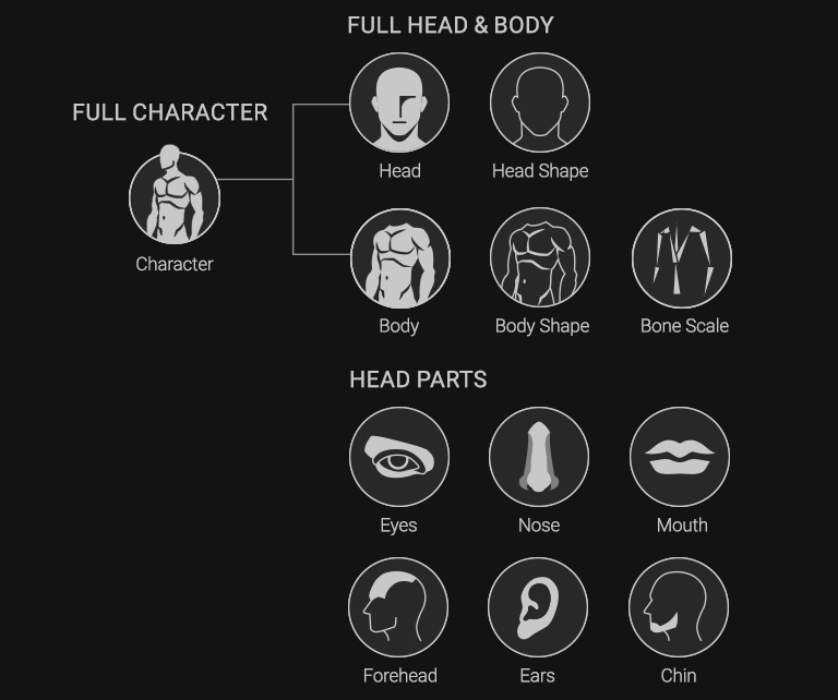 實現靈活性與品質的完美平衡。混合整個人物、僅頭部、身體,或個別臉部特徵。重新塑造整個身體而不改變骨骼比例,或調整比例同時保留原始形狀。