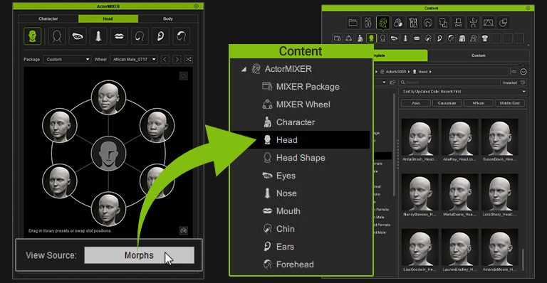 ActorMIXER 簡化您的創作流程,從直觀的插槽混合、紋理切換、家族變形,到混合器資產管理和分享。混合過程可以使用預設的姿勢或表情來視覺化,以實現更具標誌性的外觀。