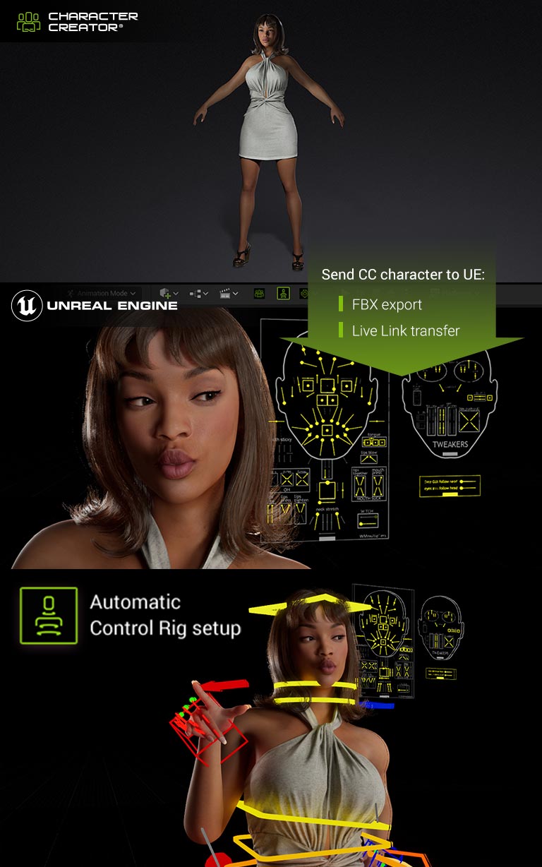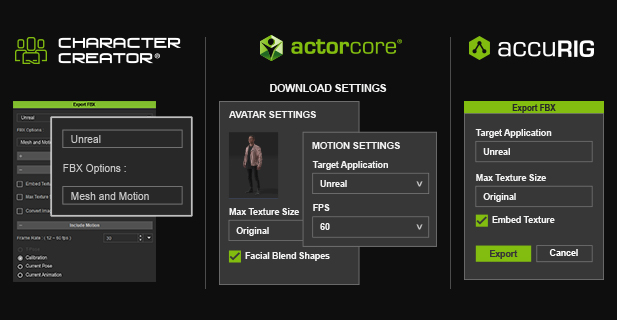 以專用的 FBX 格式,流暢地將 CC、AccuRIG 或 ActorCore 人物匯入 Unreal Engine。