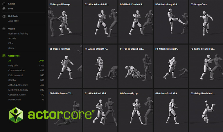 ActorCore 是一個尖端的線上 3D 動畫平台,提供大量動作捕捉動畫庫。這些動作的多樣性和靈活性有益於專業動畫製作以及互動式遊戲的角色設定。